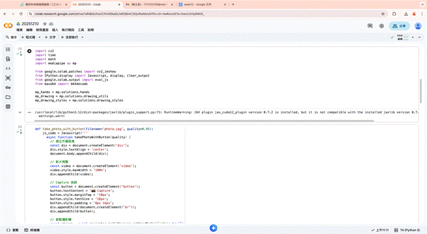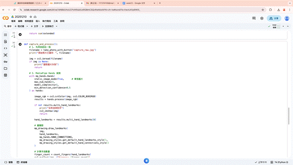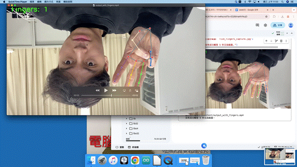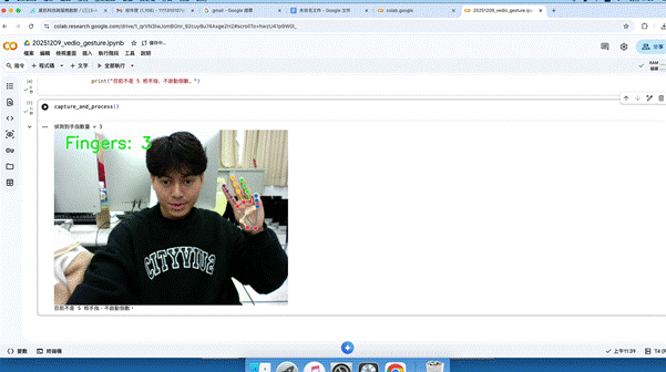 c.在 Colab 用「影片檔」做手勢+自動拍照步驟說明在 Colab 左側「檔案」區上傳一個影片,例如 test.mp4(裡面有手的畫面)執行下列程式:會逐 frame 偵測手顯示當前手指數量連續偵測到 5 根手指超過 5 秒,就自動存檔一張圖片