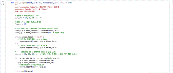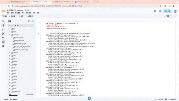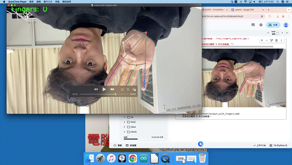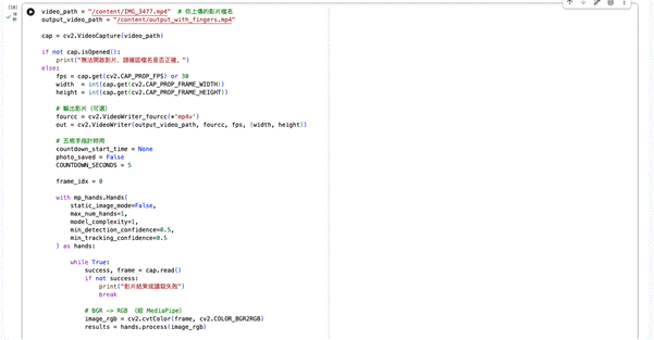 c.在 Colab 用「影片檔」做手勢+自動拍照步驟說明在 Colab 左側「檔案」區上傳一個影片,例如 test.mp4(裡面有手的畫面)執行下列程式:會逐 frame 偵測手顯示當前手指數量連續偵測到 5 根手指超過 5 秒,就自動存檔一張圖片